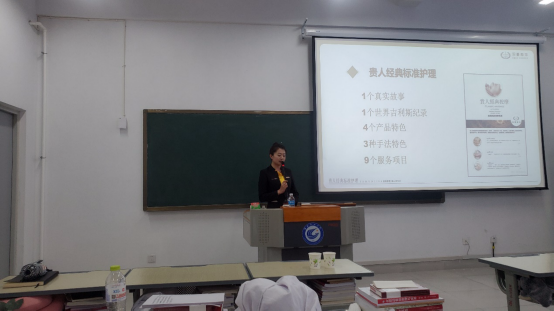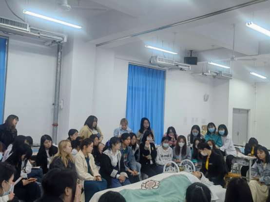 企业讲师张艳结合真实项目“贵人经典标准护理”进行了讲解,通过经典按摩专业理论、标准接待流程、标准用具使用和项目流程展示4个环节的理实一体化操作进行了现场演示。现场演示模特由学生自荐担任,现场气氛活跃,讲解结束后进行现场提问和交流,同学们对行业发展、未来实习就业、公司情况进行了深入的了解。