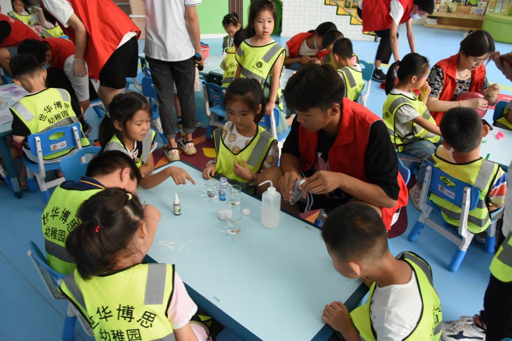 7月9号上午,化学工程学院“筑梦化学”暑期社会实践团队走进潍坊市高新区新城街道世华博思幼稚园,大学生与小朋友手拉手做趣味物理、化学小实验。我院大学生首先给幼儿园小朋友讲解了试验的小视频,让孩子们有了直观的了解。随后,小朋友们分组,一个小组由大学生与小朋友们面对面做气球转转圈、密度与扩散、隐形字的写法等趣味物理、化学小实验,期间小朋友们积极与大学生互动,提出了很多有趣的问题。此次活动对启发小朋友的科学思维有一定的帮助。下午,社会实践团队走进潍坊市经济开发区张氏街道万和社区,给普通老百姓宣讲生活中的化学等科普知识,与社区的小学生们一起做趣味物理、化学小实验,受到了小区居民的称赞,宣传了学校。