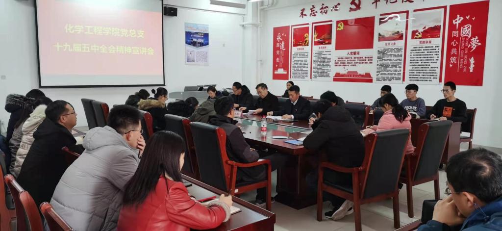 根据《中共潍坊职业学院委员会关于学习贯彻党的十九届五中全会精神实施方案》要求,按照学院党委统一安排部署,12月10日,化学工程学院党总支学习贯彻十九届五中全会精神宣讲会在木泽楼B207会议室举行,学院党的十九届五中全会精神宣讲团成员,学院党委委员办公室主任任培华到会宣讲,会议由化工学院党总支书记主持,教师党支部,学生党支部全体党员参加。