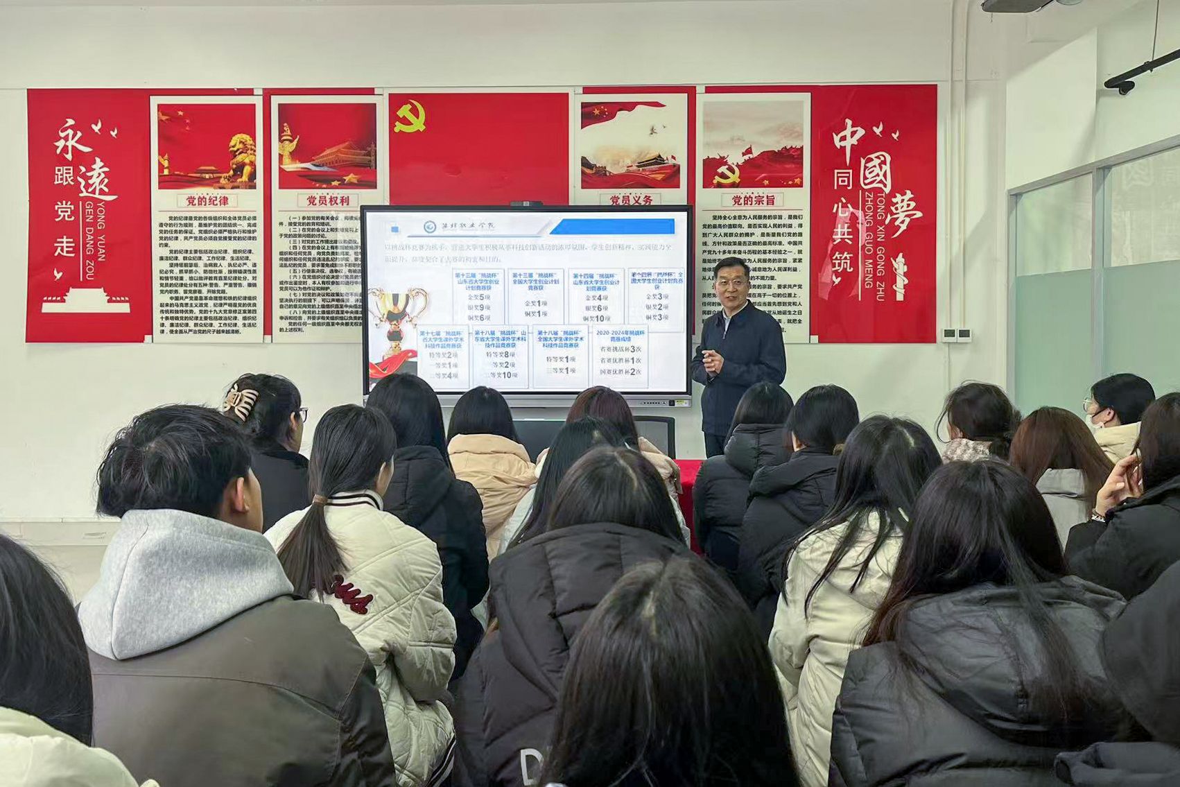 活动中,任培华围绕四门课程展开全面深入的探讨与讲解。政策形势课上,他详细介绍了黄旭华院士的科学家精神,鼓励同学们学习黄院士无私奉献、勇于创新的精神品质。结合我院优秀毕业生刘玉婷成功就业案例,为全体同学点亮了一盏追求卓越职业发展的明灯。同时,他还提及了哈尔滨亚洲冬季运动会的成功举办以及四川舰的正式入列,进一步唤起了同学们的爱国热情与民族自尊心。在思想动员课上,任培华紧密结合学院实际,向大家介绍了Deepseek的发展情况以及学院双高建设情况,传达了师生团队在第十四届“挑战杯”比赛中荣获3金2银3铜的佳绩,以及学院成功入选2025年度全国高校示范“一站式”学生社区的好消息,激励同学们为学院的发展贡献自己的力量。在安全部署课上,任培华详细讲解了防诈骗、防欺凌、防溺水、交通安全、心理健康安全等方面的知识,提醒同学们提高安全意识,确保自身生命安全和财产安全。在警示教育课上,他通过教育领域事故典型案例的分析,以案说法,使同学们深刻认识到安全的重要性。活动的最后,任培华带领全体师生回顾了总书记在2025年新年贺词中的温暖寄语,鼓励同学们将总书记的祝福转化为动力,坚定信念,勤奋学习,勇于创新,以实际行动践行科学家精神,为实现个人梦想和学院的发展目标贡献力量。