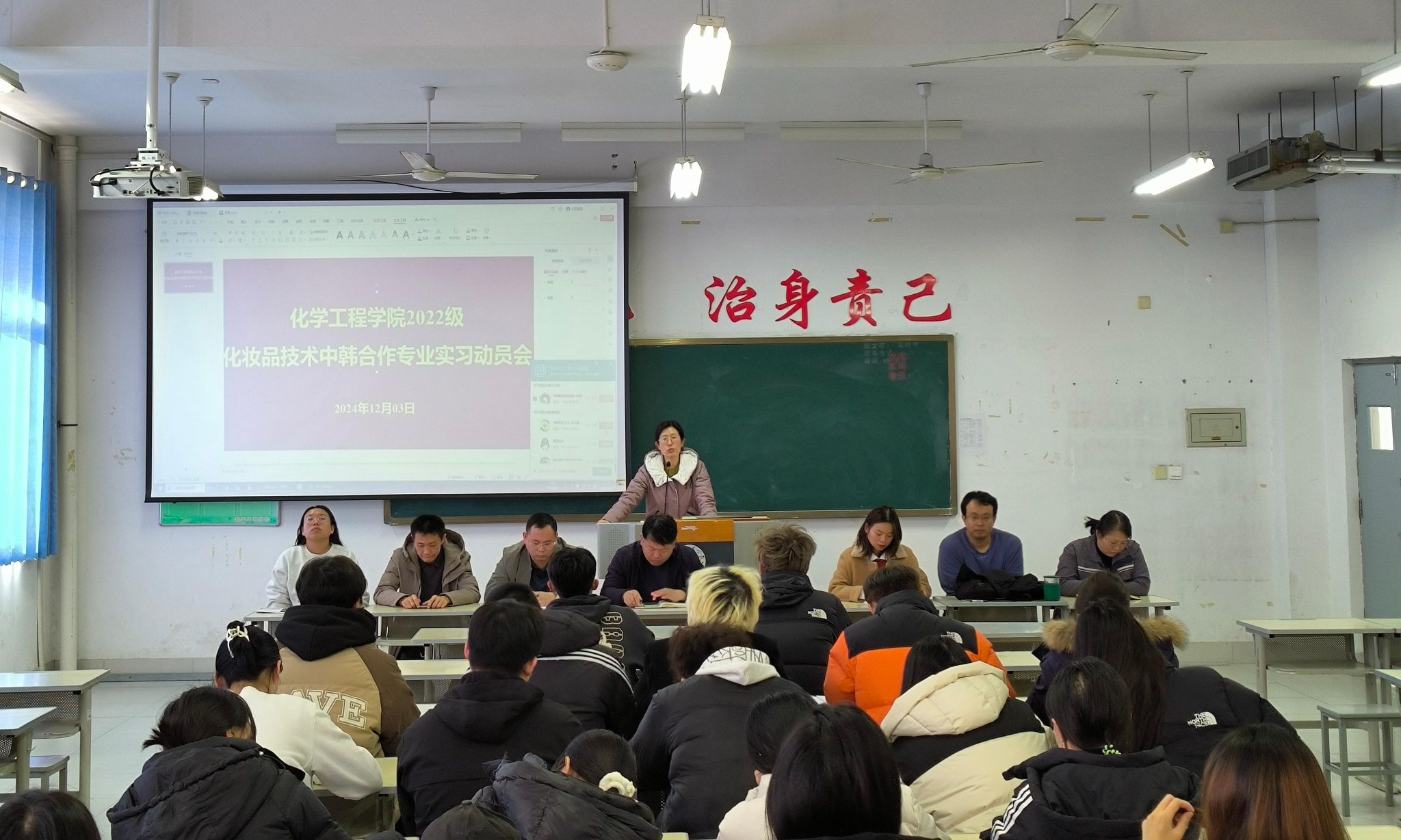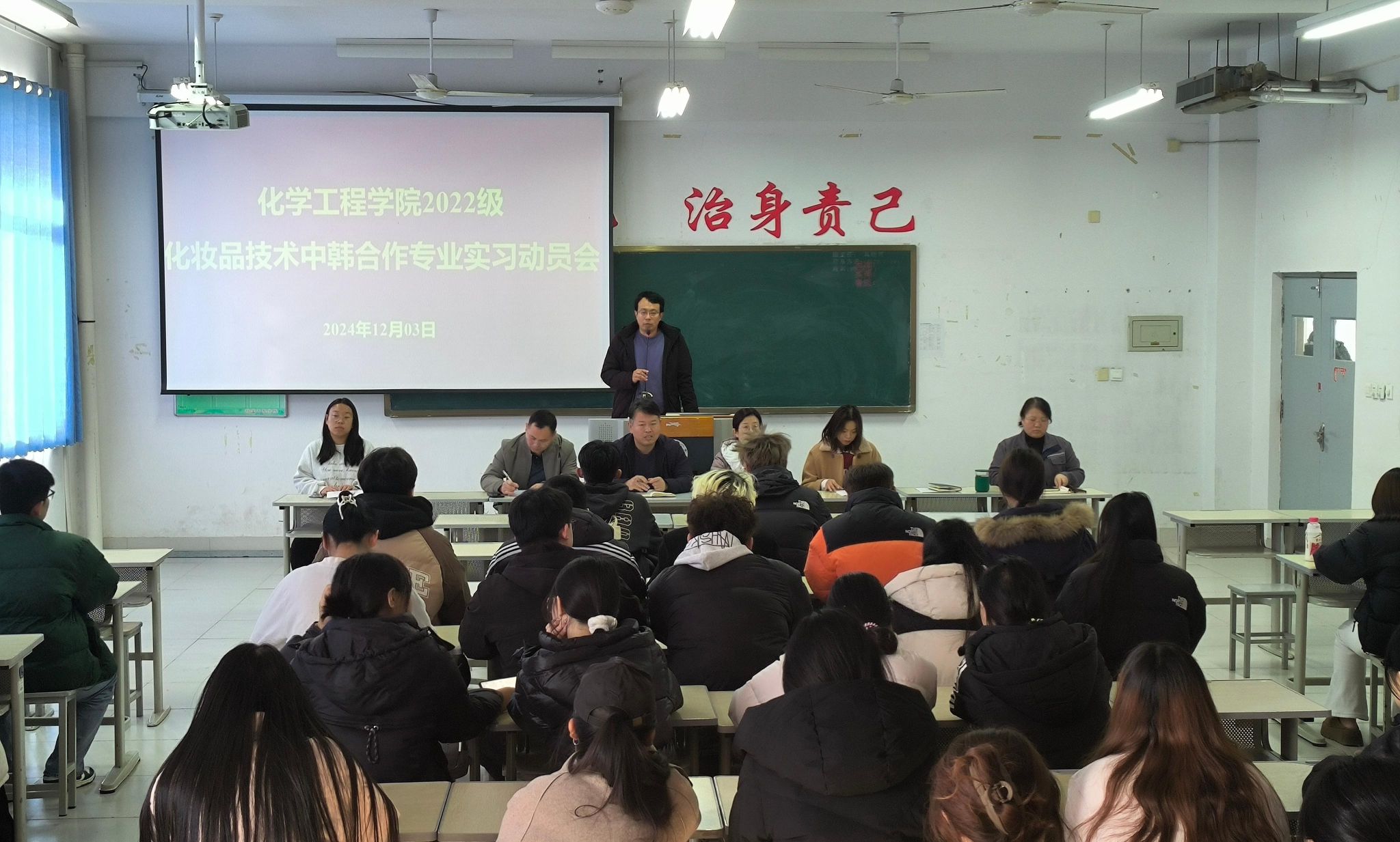 为进一步做好2022级化妆品技术中韩合作专业学生的实习工作,12月3日上午,化学工程学院学院举行2022级化妆品技术中韩合作学生实习动员会。化学工程学院书记、分管教学负责人、教学管理办公室负责老师、学团负责老师及022级化妆品技术中韩合作专业全体学生参见会议。