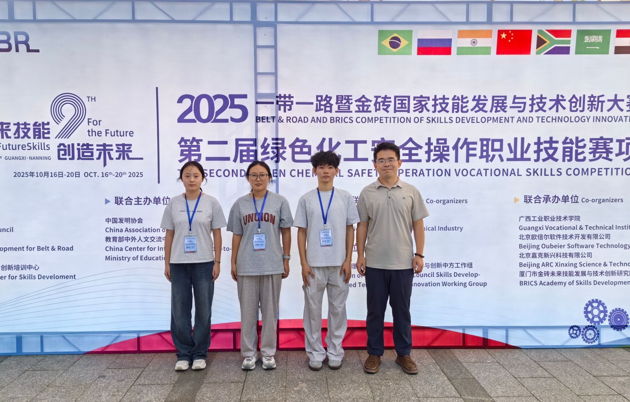 10月17日至10月20日,2025一带一路暨金砖国家技能发展与技术创新大赛“第二届绿色化工安全操作职业技能”赛项在广西工业职业技术学院举行,来自全国43支代表队共129名选手同台竞技。经过激烈比拼,由化学工程学院庞道瑞、李嘉仪、牟永仪3名选手和于传峰、杨艳玲2名指导教师组成的参赛队获得该赛项三等奖。