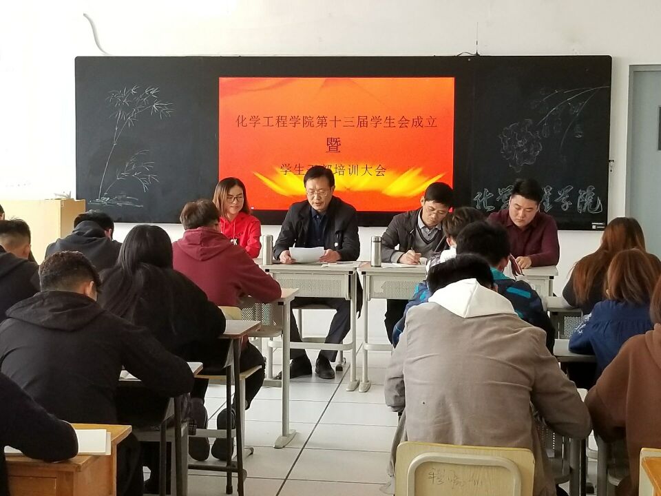 为庆祝新一届学生会成立,提高学生干部的服务意识和管理能力,培养优秀学生干部,化学工程学院第十三届学生会成立暨学生干部培训大会于2017年11月2日在惠泽一号楼A区524召开。化学工程学院副院长、团总支辅导员老师、第十二届学生会主席以及第十三届全体学生会成员参加了本次大会。
