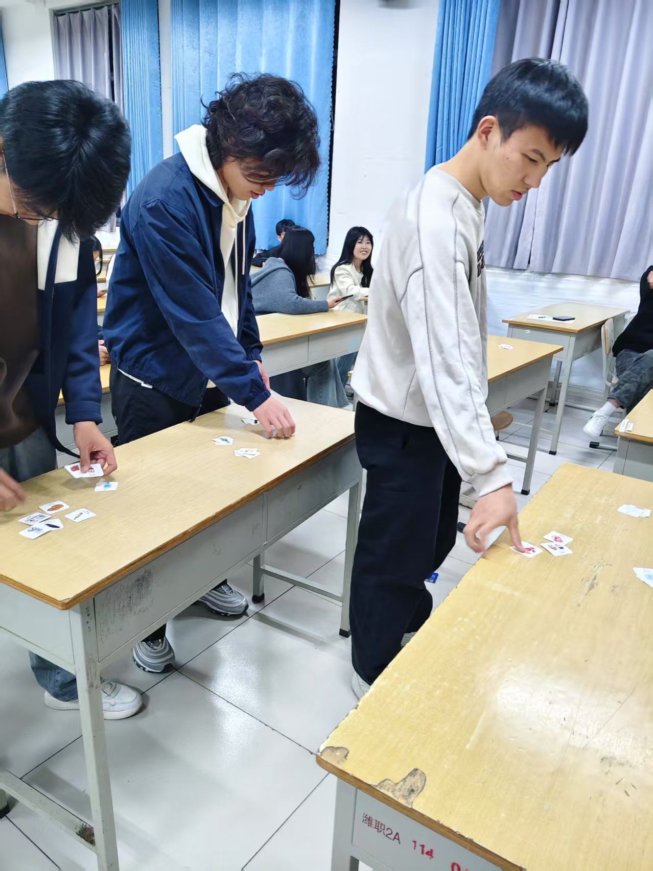 在垃圾卡片分类环节,工作人员准备了各种垃圾卡片,同学们需要将这些卡片正确投放到对应的垃圾分类桶中。大家认真思考,互相讨论,活动现场充满了求知与探索的氛围。
