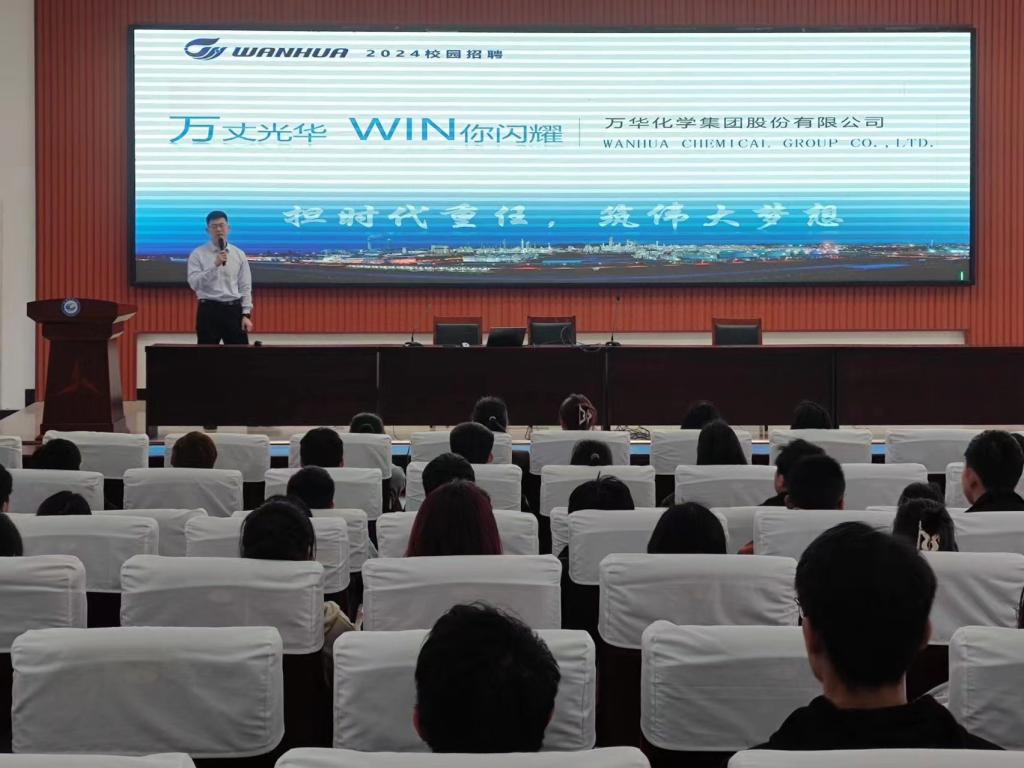 为做好2025届毕业生实习就业工作,进一步提高学生实习就业质量,化学工程学院结合前期企业用工需求和行业发展现状调研,统筹安排,开展2024年春季优质企业宣讲进校园活动。活动邀请行业龙头企业万华化学集团股份有限公司、齐翔腾达股份有限公司到学院进行宣讲,应用化工技术、分析检验技术等专业2025届毕业生共计200余人参加宣讲会。