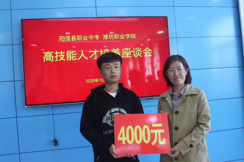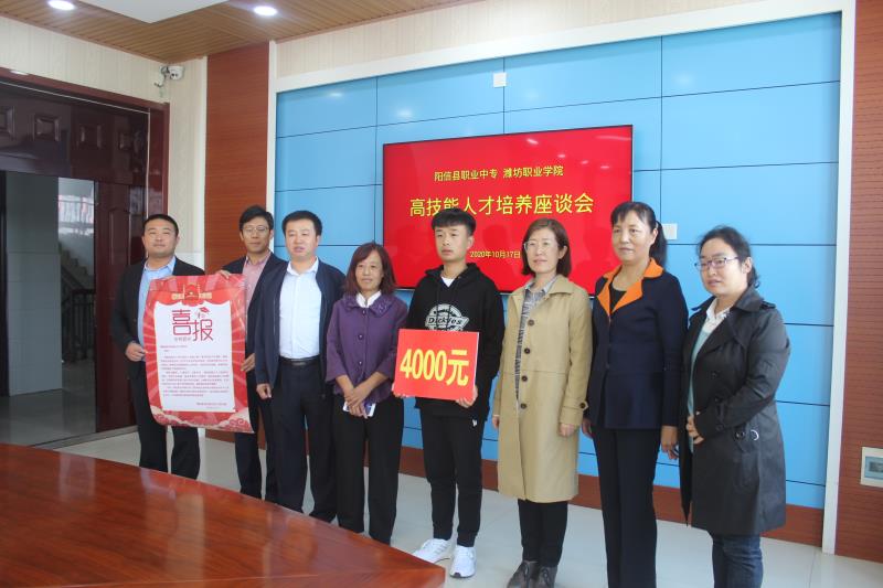 双方举行了座谈。阳信职业中专副校长阎汝强介绍了该校学生的生源情况、教师爱岗敬业的工作作风,特别指出该校学生对我院的认可度极高,感谢潍坊职业学院对阳信职业中专在教学资源共享方面给予的支持,希望依托名师工作室,能更好的细化优化中高职衔接培养中的具体工作,扩充三二连读人才培养计划,使更多的中职学生受益。我院化学工程学院教学负责人马天芳首先对阳信职业中专每年为我院输送高素质学生表示感谢,她指出,应用化工技术专业是国家骨干专业,非常注重人才培养质量的提升,将对高职阶段的三二连读学生实行个性化培养;同时,为了吸引优秀生源,我院出台了专门的奖励办法,对在全国职业院校技能大赛中获奖的同学在单招考试中实行免试入学政策,并根据获奖等次给予奖励。借我院新生入学之机,名师工作室专程为被我院2020年单招免试录取的优秀学生全国职业院校技能大赛二等奖获得者吕明辉同学送去喜报、颁发了优秀学生奖金,希望通过我们两校合力培养,学生能够成长为社会需要的高素质技能人才。