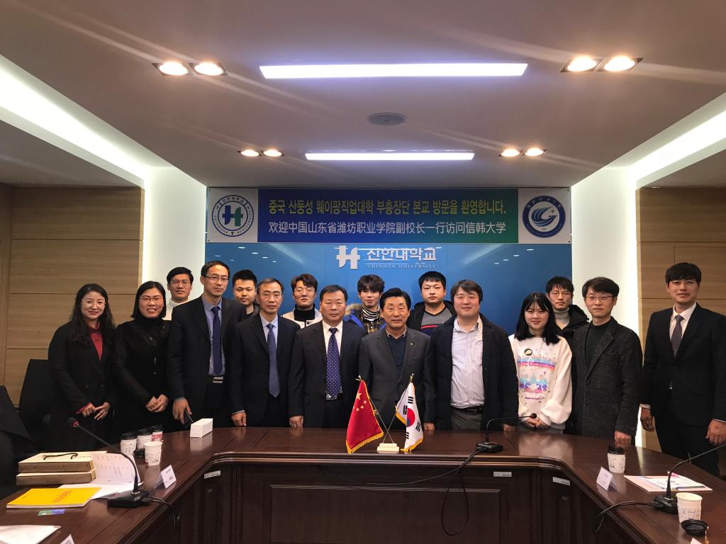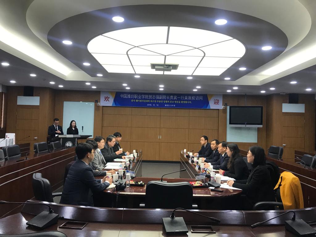 在韩国,代表团访问了信韩大学,与国际处处长李大洪等就两校目前活跃开展的交换生项目进行了交流,对持续扩大交换生项目交换意见并达成共识,就进一步拓展2+1+2学历提升项目进行了深入探讨。座谈会后看望了我院在该校的交换生,与学生进行了亲切交流,了解学生在韩学习生活情况。韩国湖西大学副校长姜俊模等人接见了代表团,共同回顾了两校自2009年建立校际交流关系以来的合作情况及我院2009年派往该校的交换生在该校博士毕业回国内高校就业的成功案例,就两校未来的合作方式进行了深入会谈,在教师研修、学生学历提升、交换生项目的进一步推进达成了广泛共识。在韩国建阳大学,校长李源默等接待了学院代表团,双方进行了会谈交流,签署了校际交流协议书,重点就建阳大学国际美容化妆专业与我院化学工程学院化妆品技术专业开展合作办学进行了深入探讨,在听取该校美容化妆专业的特色和优势,比较两校专业课程设置情况课后,对开展两校合作办学的可能性达成了共识,并实地考察了该校美容化妆专业的实训室、教室。在韩国湖南大学,校长朴相澈亲切会见了代表团一行,签署了两校专升本合作协议,举行了两校中韩教育交流中心挂牌仪式,今后将以此中心为平台,继续扩大师生交流和校际合作。会后调研了湖南大学未来汽车自动驾驶研究所、语学堂等场所,看望了我院赴湖南大学的留学生,并开展座谈。代表团还访问了韩国朝鲜大学。