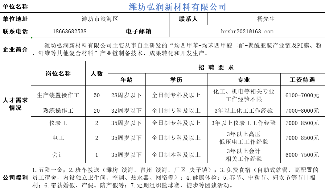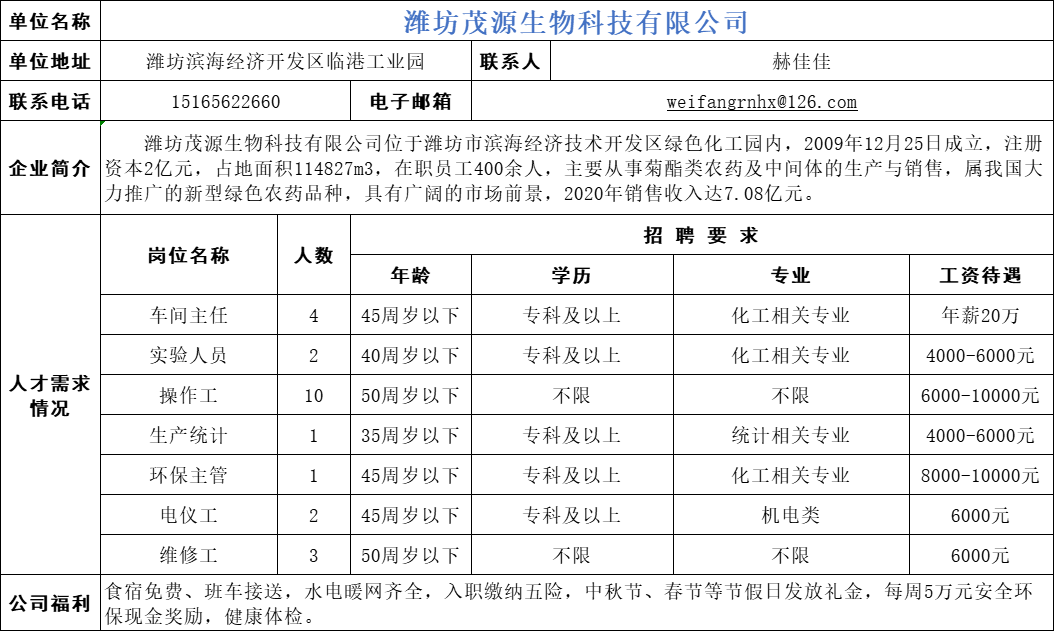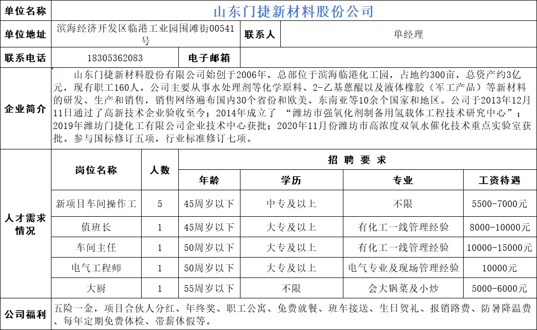 为推动高校毕业生精准就业,同时帮助企业解决招工难题,现发布山东佛士特环保处置有限公司、山东冀凯装备制造有限公司、山东门捷新材料股份公司、潍坊弘润新材料有限公司、潍坊茂源生物科技有限公司、中碳能源(山东)有限公司等企业招聘信息,提供岗位164个,涵盖化学化工、电气工程等重点岗位,为求职者提供最新招聘信息,实现企业用工、学生就业双向奔赴!