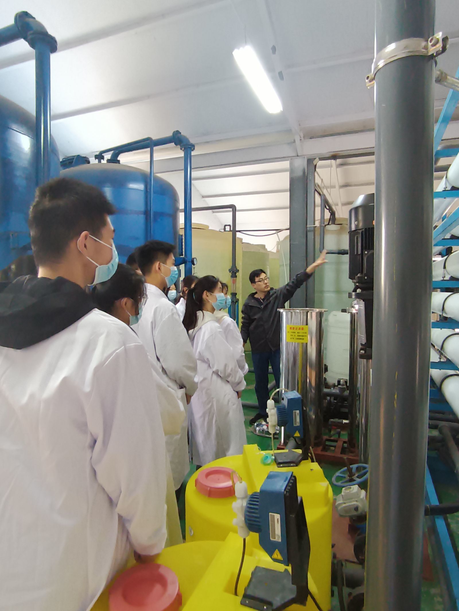 本次活动以参观、实践操作的形式开展。活动开始时,指导教师带领大家重温了习近平总书记历年来关于治水、护水、节水、用水的相关重要论述,然后在老师的带领下参观了校园苦咸水淡化车间,了解了利用反渗透技术原理使盐水脱盐淡化制备饮用水的设备及制备过程。之后,在指导老师的指导下,我们检测了校园内河流、自来水、直饮水的PH,了解了水质指标的基本要求。